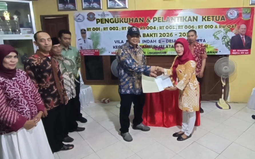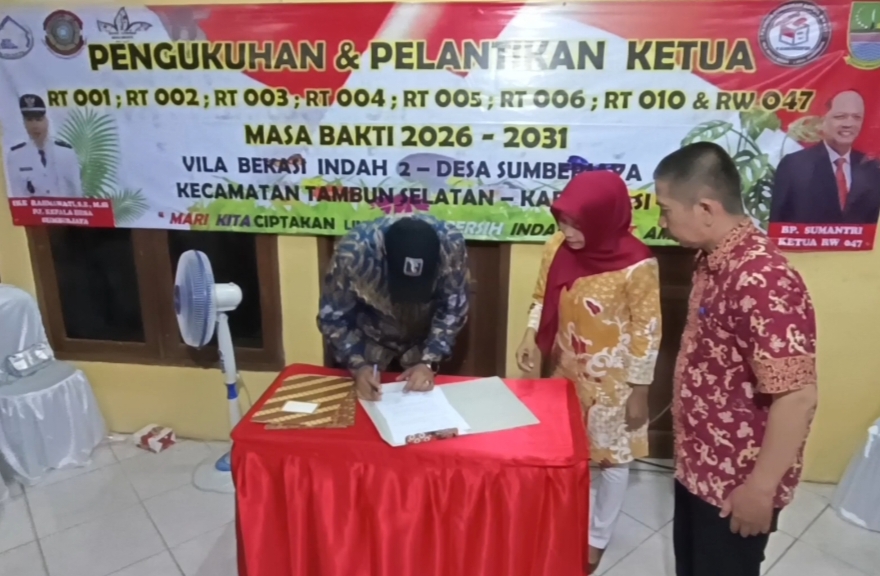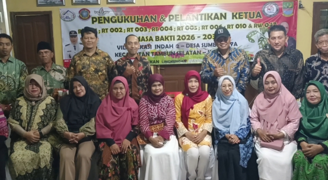 Ketua RT dan RW terpilih di lingkungan Perumahan Villa Bekasi Indah 2, RW 047, Desa Sumberjaya, Kecamatan Tambun Selatan, resmi dikukuhkan dan dilantik untuk masa bhakti 2026–2031. Kegiatan tersebut berlangsung di Kantor Sekretariat RW 047 pada Minggu (19/4) malam.