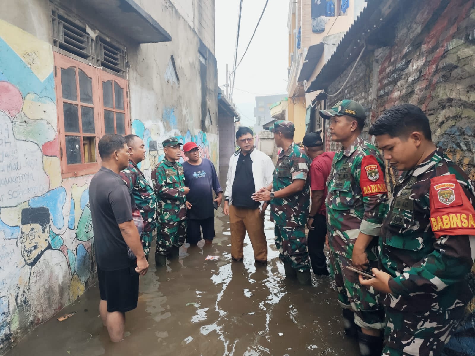 Komandan Kodim 0509/Kabupaten Bekasi, Letkol Arh Sabdho Aji Wibowo, M.Han., turun langsung ke lokasi banjir sekitar pukul 15.20 WIB untuk meninjau kondisi warga sekaligus memastikan penanganan berjalan dengan baik.